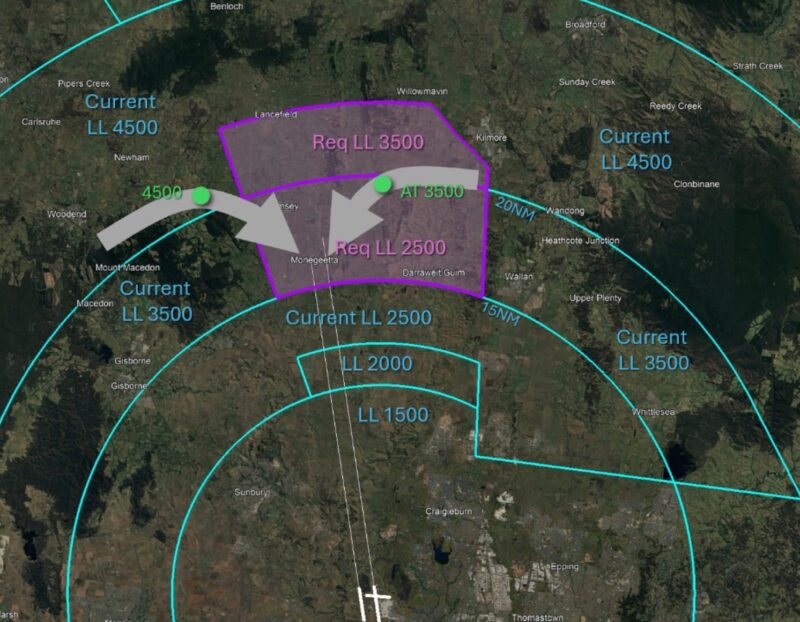 To the north, the Kilmore Gap appears untouched, but directly west, to of Kilmore and Wallan, up to Lancefield and just west of Romsey, will be decreased to 2500ft
